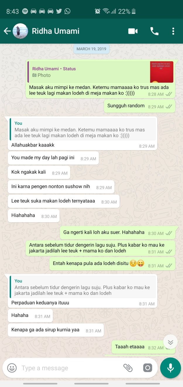 Malem itu saya mimpi. Saya sedang di Medan, di rumah salah satu teman. Saya sedang makan sayur lodeh ditemani oleh Leteeuk (– Leader Super Junior). Sungguh kehaluan yang hqq.