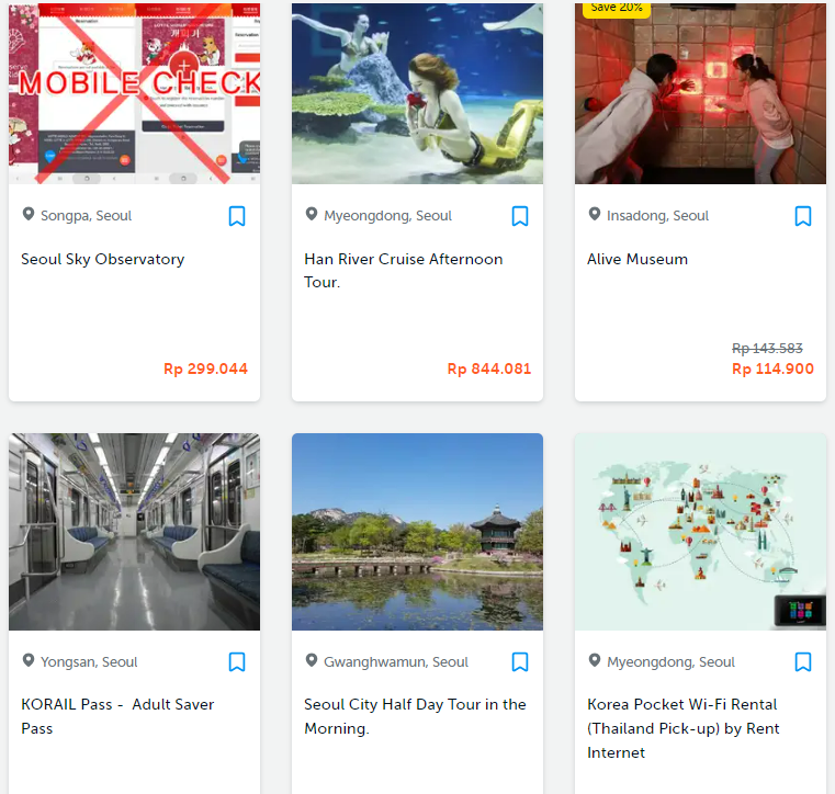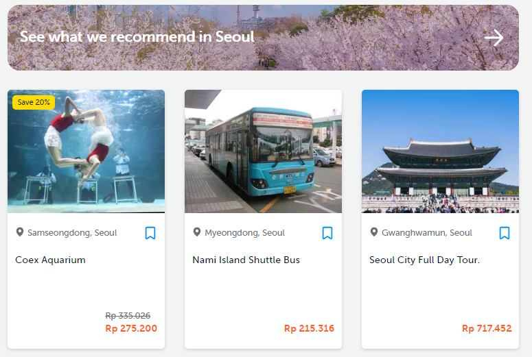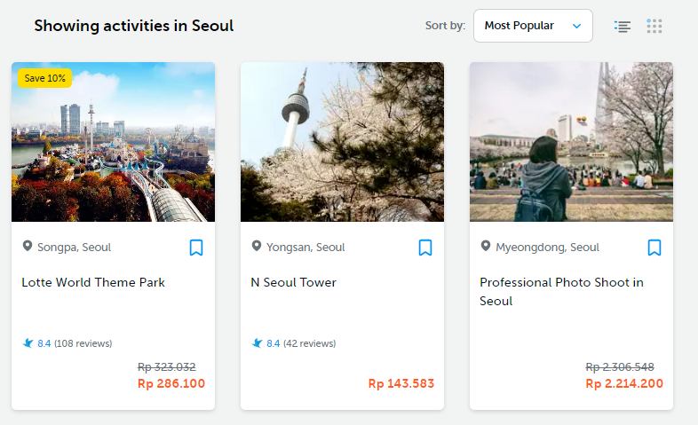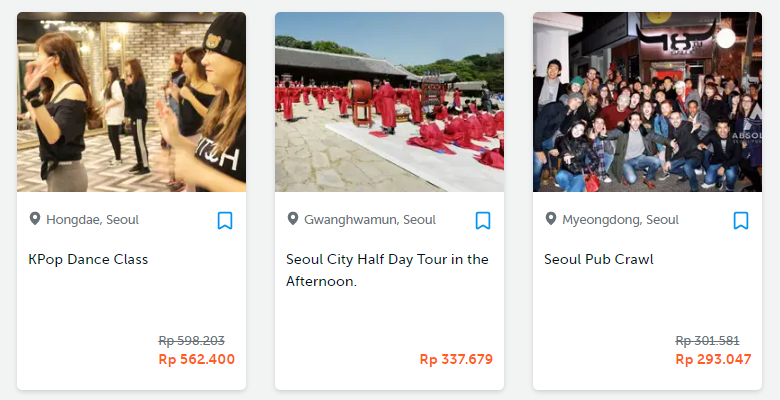 Tampilan pertama setelah saya masukkan kata kunci Seoul ada 3 most popular activities Seoul!